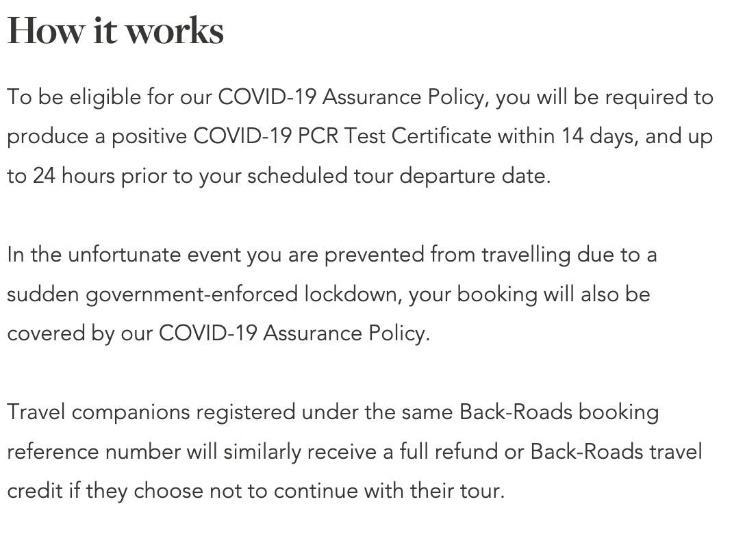 Website copywriting supporting the launch of Back-Roads Touring flexible travel policies after the COVID-19 pandemic.